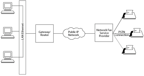 目前,許多的Internet傳真服務(wù)僅能提供存儲轉(zhuǎn)發(fā)傳真,這種服務(wù)在用戶電腦終端和世界其他地方的傳真網(wǎng)關(guān)連接在一起。這是一種傳統(tǒng)LAN傳真技術(shù)的擴(kuò)展,客戶端的傳真網(wǎng)關(guān)允許客戶端PC或者工作站創(chuàng)建文檔并通過一個通用網(wǎng)關(guān)發(fā)送傳真。
