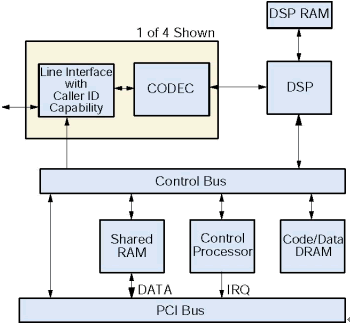 一個板卡上的微處理器控制D/4PCIU和D/4PCIUF通過一個本地總線控制板卡所有操作,它從主機截獲和執(zhí)行命令。這個微處理器處理實時的事件,管理和主機交互的數(shù)據(jù)流,提高系統(tǒng)的反應(yīng)時間,減少主機處理的需求,傳遞給應(yīng)用程序之前處理DTMF和電話信令,把DSP解脫出來專門做信令處理。這個微處理器和主機的通信是通過一個共享RAM,它作為一個輸入/輸出緩沖區(qū)增加的磁盤文件傳輸?shù)男。這個RAM和主機的接口是PCI總線。為了滿足實時系統(tǒng)的要求,所有操作的是中斷驅(qū)動的。所有安裝在PC里面的D/4PCIUF板卡共享同一個中斷。在系統(tǒng)初始化的時候,固件從主機下載到板卡上的代碼/數(shù)據(jù)