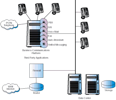 圖1描述了當(dāng)前一個典型的復(fù)雜的企業(yè)通信系統(tǒng)配置。連接到PSTN的主要部分PBX/KTS,仍然是系統(tǒng)的核心,提供了交換和自動呼叫分配的功能。一系列增加的應(yīng)用通過附屬服務(wù)器連接到PBX/KTS上。很多附屬服務(wù)器也連到數(shù)據(jù)中心上,因為它們需要訪問企業(yè)的數(shù)據(jù)。 使現(xiàn)有情況變得更為復(fù)雜的是,Internet正在變?yōu)椴豢扇鄙俚纳虅?wù)工具,各公司紛紛安裝VoIP以降低網(wǎng)絡(luò)成本,滿足多媒體通信的需要。這些服務(wù)由企業(yè)防火墻后的網(wǎng)關(guān)提供,這個網(wǎng)關(guān)也是連接到PBX/KTS上的。