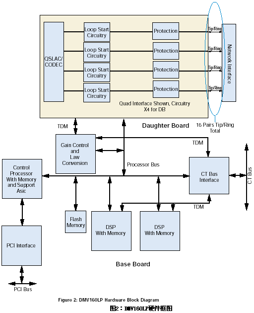 從連接到DMV160LP板卡的16條環(huán)路電話線上來(lái)的信號(hào)首先要通過(guò)電話線接口,該接口可以提供對(duì)瞬間電流的保護(hù)以及對(duì)電磁干擾的抑制。這些電話線接口使用了可靠的晶體開(kāi)關(guān)(沒(méi)有機(jī)械連接)和FCC-Part