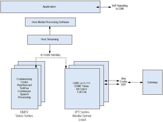 如圖2所示,IPT系列板卡可以通過H.110總線連接到任何一個(gè)高密度的Dialogic Dialogic DM/V語音系列媒體處理板卡上。開發(fā)商通過組合IPT系列和DM/V板卡,便可以分發(fā)他們的解決方案,包括語音處理、傳真、講話以及會(huì)議功能,這套解決方案可以使每個(gè)系統(tǒng)可以從數(shù)以百計(jì)的端口升級(jí)到數(shù)以千計(jì)的端口。開發(fā)商也可以選擇使用IPT系列板卡作為高密度接口板卡,并連接到PCI總線使其可以訪問在主機(jī)處理器上執(zhí)行的媒體處理功能。