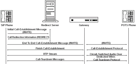 圖5里的重定向服務(wù)器,只處理發(fā)給被叫方的第一個INVITE消息,并反饋一個特殊的回應給主叫方。主叫方從回應中取出一個新的地址,并給這個地址發(fā)送INVITE消息。這個地址可能是真實的被叫方,代理服務(wù)器或者另一個重定向服務(wù)器。從這以后,所有消息都直接在主叫方和新的地址之間傳遞。